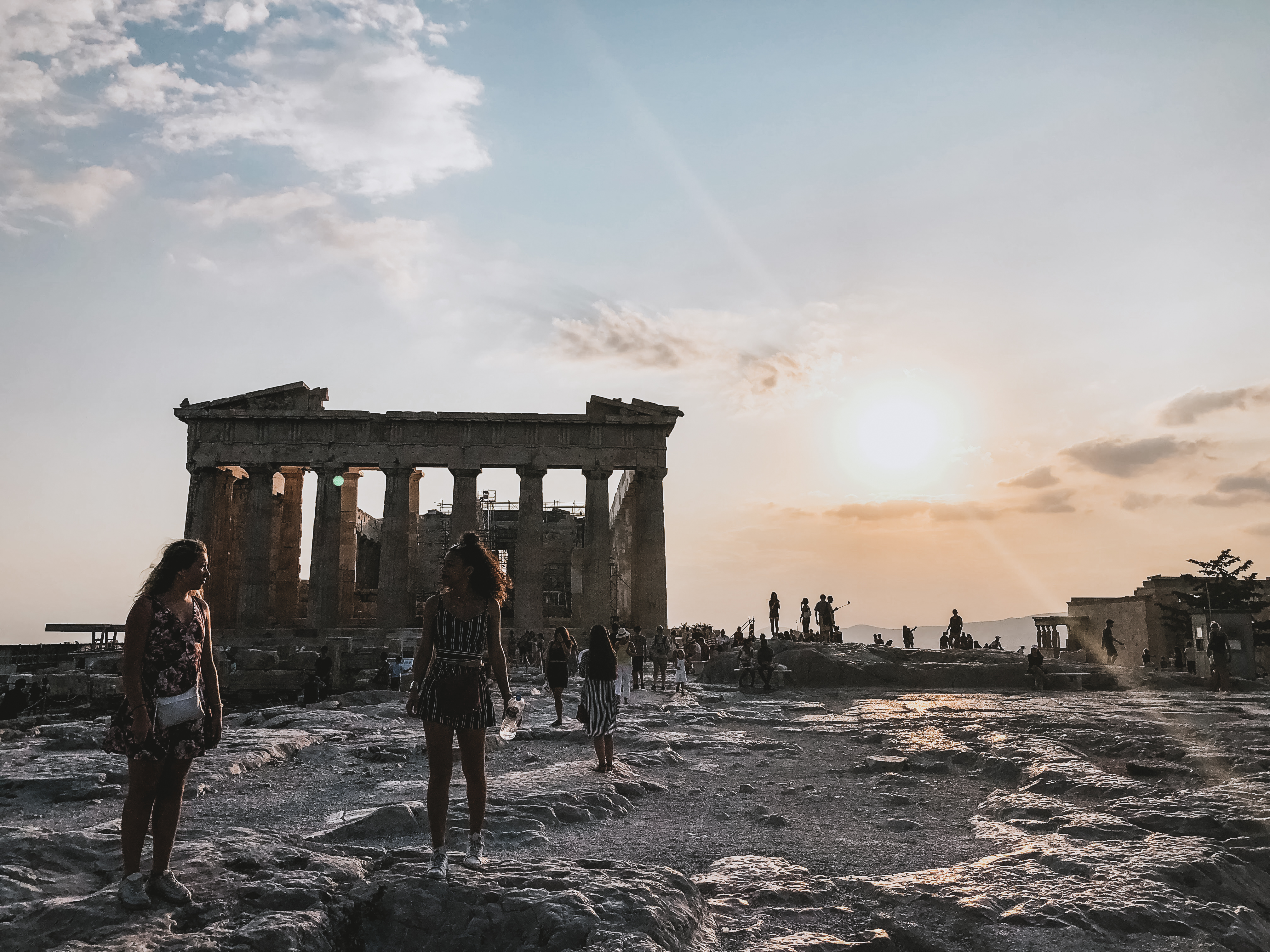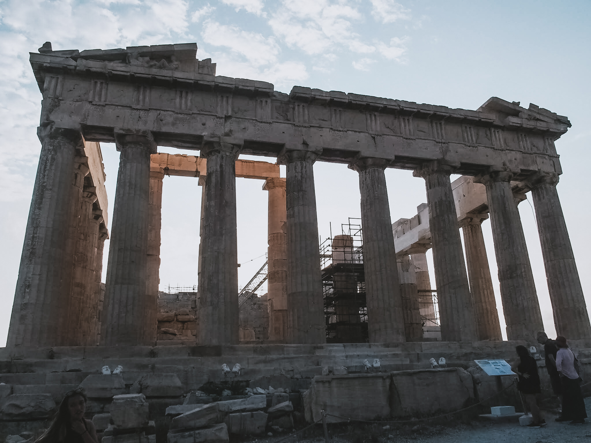 Pour ne pas avoir à supporter la chaleur écrasante de cette fin de mois d’août en Grèce, nous sommes allées visiter l’acropole d’Athènes en fin de journée, vers 16h. L’acropole est perché sur les hauteurs de la ville et le lieu est d’un calme assez apaisant pour découvrir les ruines. Pour notre part, munies du guide Lonely Planet, nous nous lançons dans le décryptage de chaque recoins, présentés dans notre petit livre.