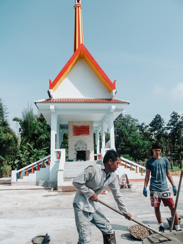 Le crématorium était déjà construit, notre rôle était de poser le sol autour de celui-ci qui était entouré de rizières, c’était très beau. En Thaïlande, l’enterrement d’une personne de la communauté ou d’un moine est célébré comme une fête, le lieu était donc décoré de nombreuses couleurs et de la céramique devait encore être posée. En effet, pour eux, la mort représente la fin d’un cycle de vie mais signifie aussi le début d’un nouveau; c’est pourquoi certaines familles sont prêtes à dépenser toutes leurs économies pour offrir la crémation au défunt.