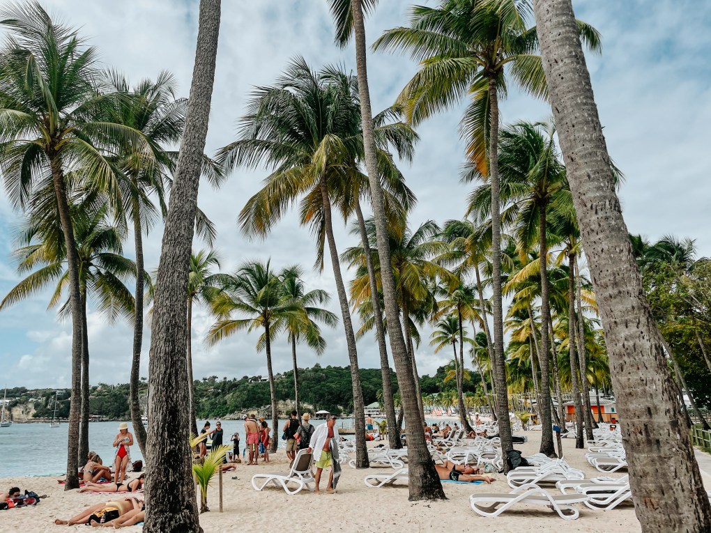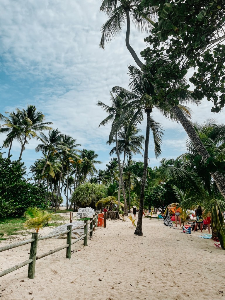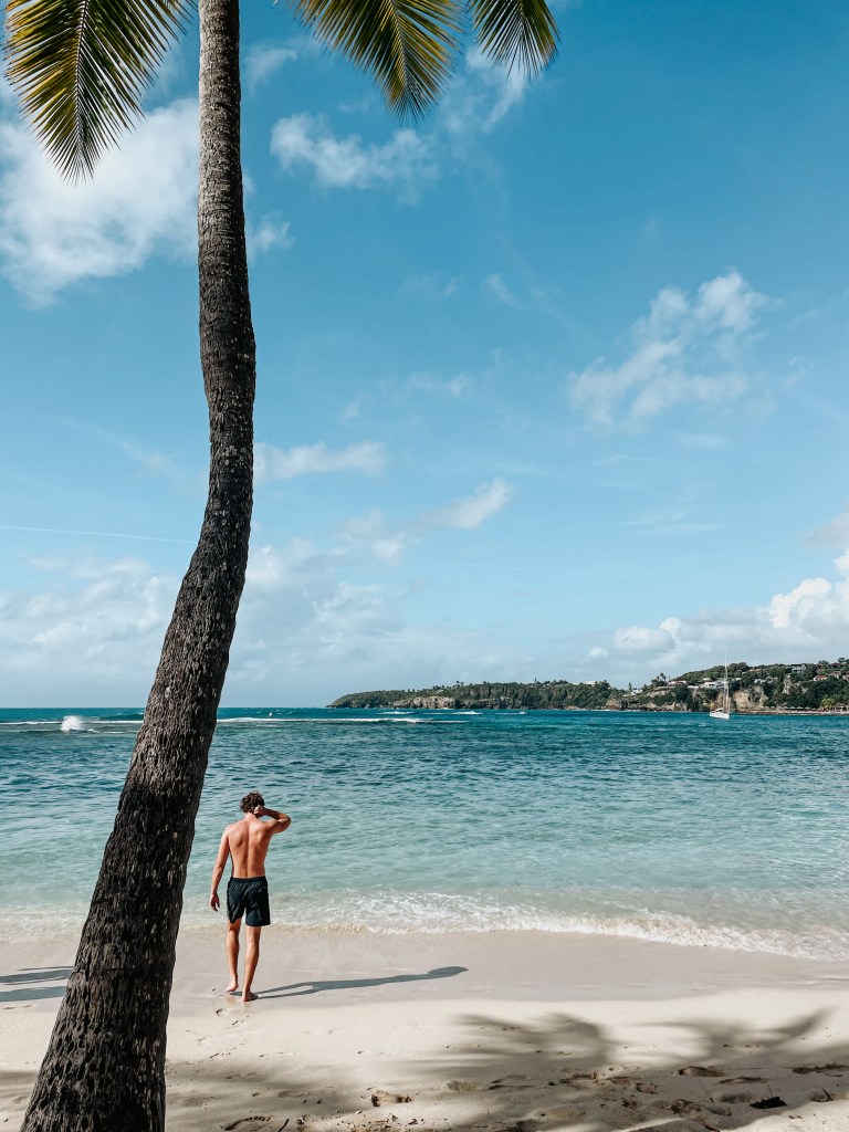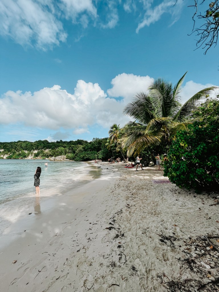 Avec peu d’espoir, nous avons continué notre aventure de la journée par la plage de la caravelle. A notre arrivée, nous nous sommes garés dans un parking gardé par des locaux en échange de deux euros. On prends nos affaires de plages et on longe les vendeurs de coco sur leurs petits stands avant d’arriver au bord de la mer. Il faut continuer de marcher quelques minutes sur la droite avant d’arriver à la plage de la caravelle et ses nombreux palmiers. À mon grand étonnement, la plage n’était pas noir de monde et on a facilement trouvé un endroit où poser les serviettes avant de passer le reste de la matinée dans l’eau chaude et turquoise de Guadeloupe.