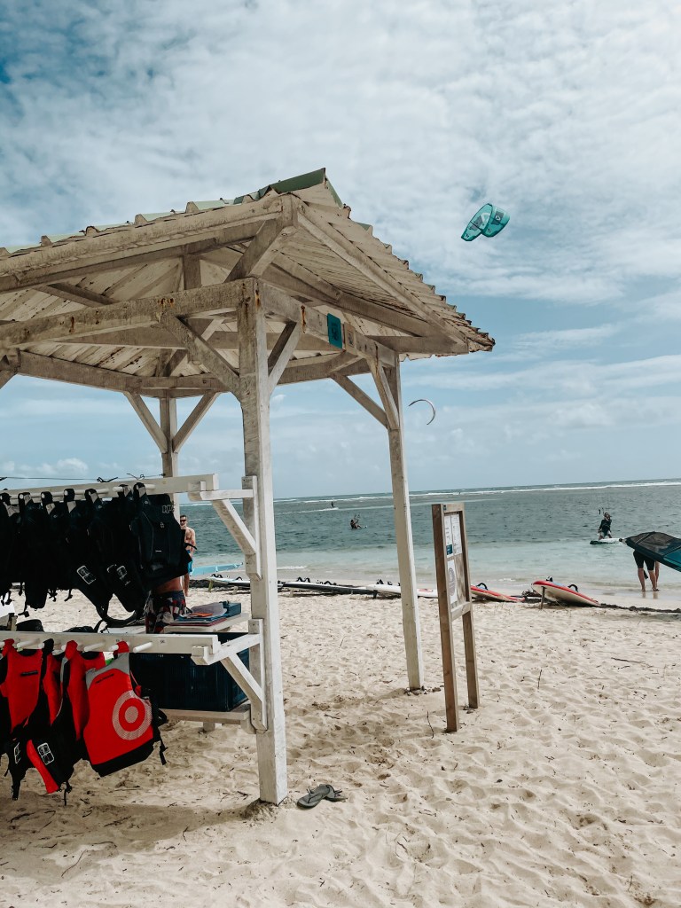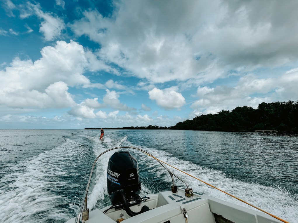 Pour cette première matinée en Grande-Terre, nous nous offrons le plaisir de faire la grasse matinée jusqu’à 10h. À notre réveil, la pluie est encore au rendez-vous mais, la veille nous avions réservé une activité où la pluie n’allait pas nous impacter : une matinée wakeboard. Je suis tombée fan de ce sport nautique lors d‘un de mes séjours UCPA à Lacanau et je voulais le faire découvrir à Corentin, mon copain. Nous avons donc trouvé une association qui permettait l’initiation au wakeboard tiré par un bateau à Baie Mahault. A notre arrivée, à 11h30, on nous propose gentiment une boisson pendant qu’ils préparent le bateau pour le départ et pendant près d’une heure nous nous régalons à s’initier au Wakeboard avec des moniteurs hyper sympas. (Corentin arrive même à se lever du premier coup !)