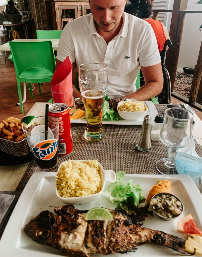 Avant de partir déjeuner, nous avons pris une douche ) la douche de la plage avant d’enfiler des affaires propres et de se rendre au restaurant. Pour ce dernier repas, nous avons choisi le restaurant : Le Lucullus, un restaurant proposant des spécialités et des poissons frais et locaux mais surtout accessible à pied depuis la plage. Nous avons tous les deux commandé du perroquet (un poisson) à la sauce chien et encore maintenant nous en rêvons la nuit, c’était juste délicieux.